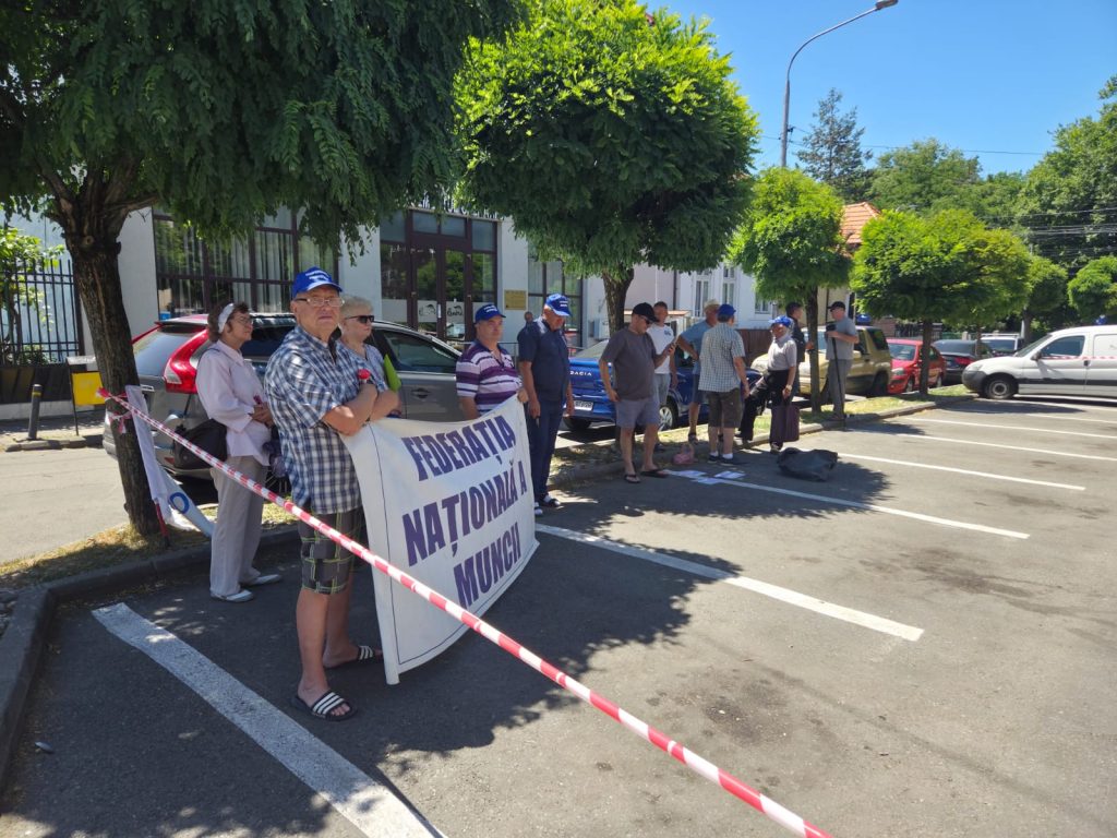 După cum au anunțat, sindicaliștii lui Constantin Crețan au protestat, joi, la Târgu-Jiu, în parcarea de lângă Prefectura Gorj, zona din fața instituției aflându-se în lucrări de modernizare.