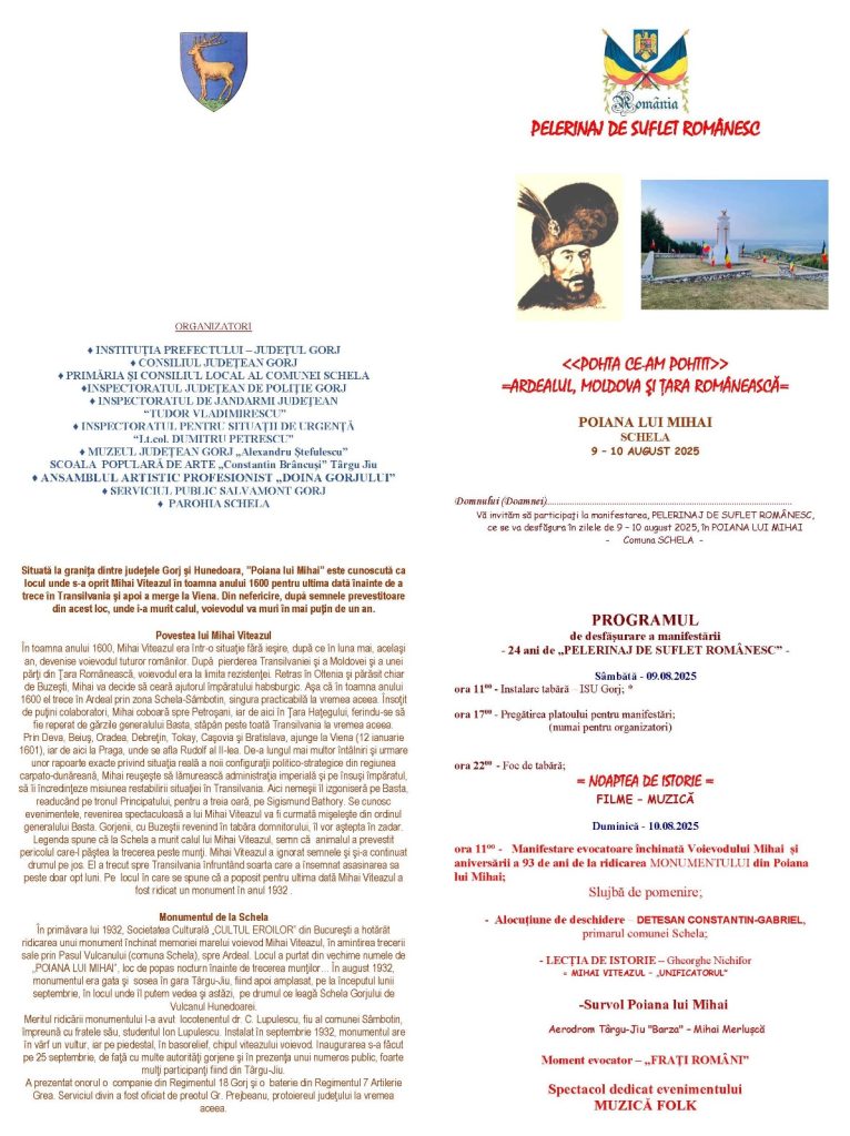 Manifestarea ”Pelerinaj de suflet românesc” se va desfășura, la finalul acestei săptămâni, pe 9 și 10 august, în Poiana lui Mihai din comuna Schela.