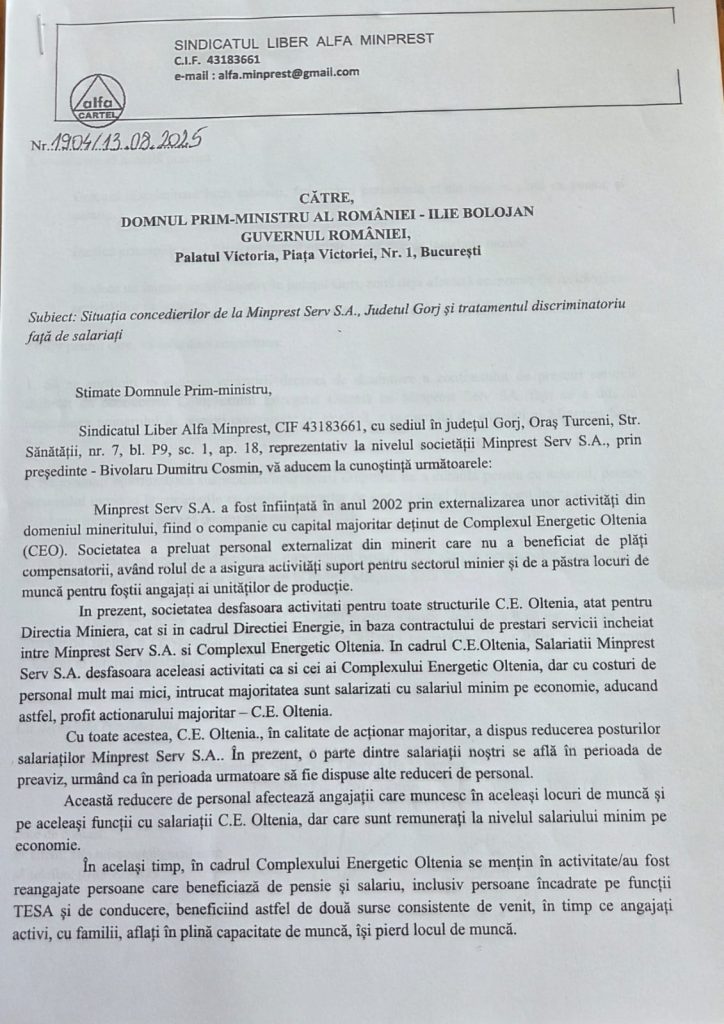 Liderul sindical din cadrul societății prestatoare de servicii în Complexul Energetic Oltenia, Cosmin Bivolaru, i-a trimis adresă premierului Ilie Bolojan prin care l-a întiințat de situația disponibilizărilor.