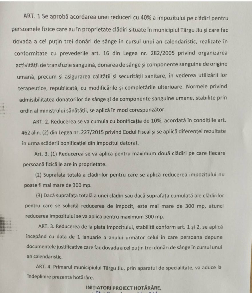 Consilierii AUR din Târgu Jiu propun ca donatorii de sânge să beneficieze de o reducere cu 40% a impozitului pe clădiri.