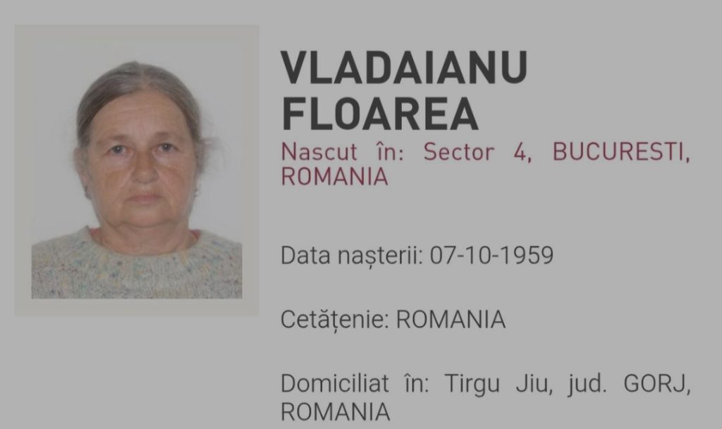 ”În data de 29.08.2025, numita Vladaianu Floarea, în vârstă de 65 ani din Municipiul Târgu Jiu, județul Gorj a plecat în mod voluntar de la domiciliu și până în prezent nu a mai revenit. Semnalmente: înălțimea de aproximativ 1,60 m, greutate aproximativă 50 kg, păr lung, cărunt, ochii de culoare albastru, fața rotundă, ten deschis. Nu se cunosc articolele de vestimentație purtate la momentul plecării voluntare, știindu-se doar faptul că, numita Vladaianu Floarea purta papuci” transmite IPJ Gorj.