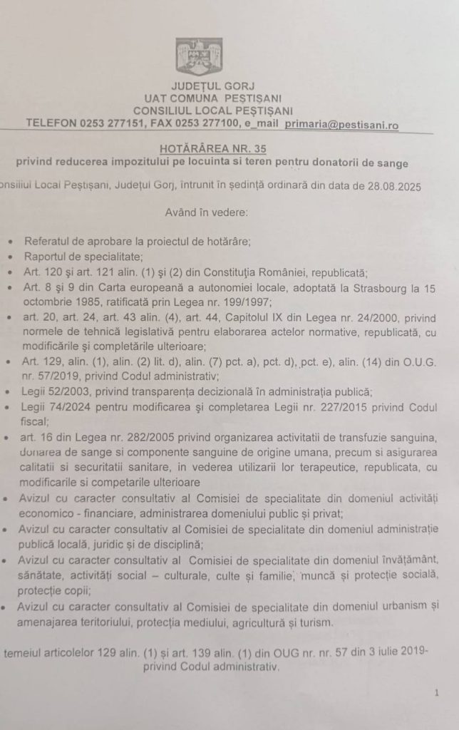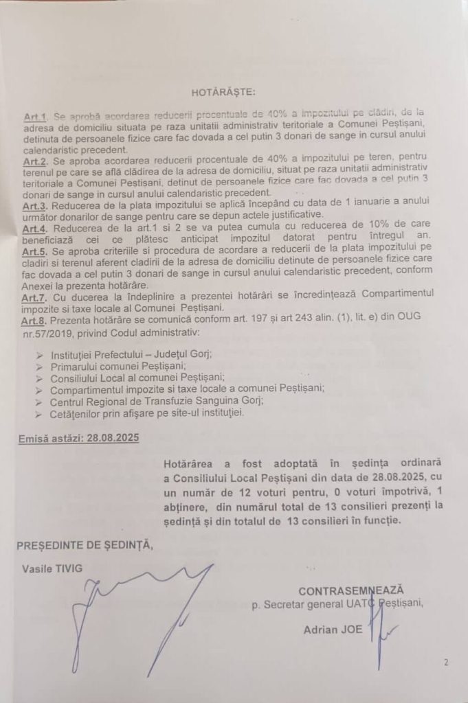 „Și Primăria Peștișani susține donarea de sânge. Reducerea cu 40% a impozitului pe locuința de domiciliu și terenul pe care se află aceasta. Reducerea se aplică persoanelor fizice, proprietari de locuințe, cu domiciliul în Comuna Peștișani, care, pe parcursul unui an calendaristic, donează sânge de cel puțin trei ori. Cererea de reducere a impozitului, împreună cu dovada celor minim trei donări de sânge, se depune la Compartimentul taxe și impozite al Primăriei Peștișani, până la data de 31 Decembrie a anului în care ați donat sânge, de cel puțin trei ori. Reducerea se aplică la impozitul aferent anului următor. Reducerea poate fi cumulată cu reducerea de 10%, pentru plata anticipată a impozitului anual. Mulțumesc colegilor din Consiliul Local Peștișani și conducerii Primăriei Peștișani pentru susținere!” a notat consilierul local Vasile Tivig (USR), pe Facebook.