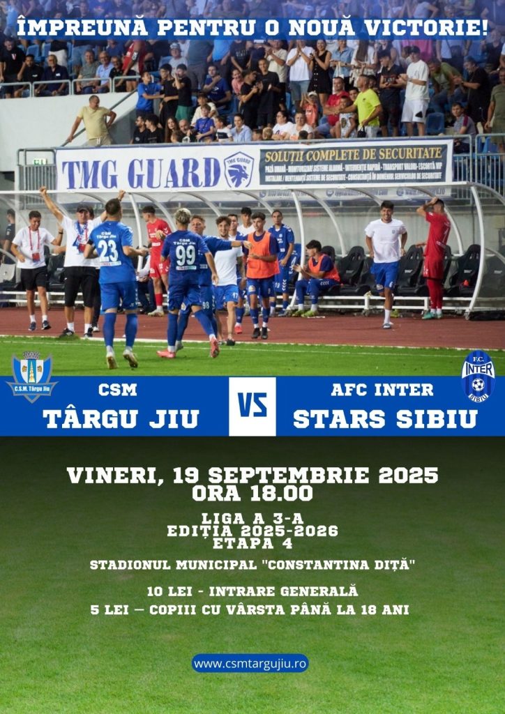 CSM Târgu Jiu revine pe Municipal, vineri, pentru o nouă confruntare din Liga a 3-a. După victoria obținută etapa trecută pe terenul echipei ACS Mediaș, scor 1-0(gol Bebeto Lupuleț), băieții lui Mario Găman se vor confrunta cu Inter Stars Sibiu, de la ora 18:00. Gorjenii țintesc a treia victorie consecutivă.