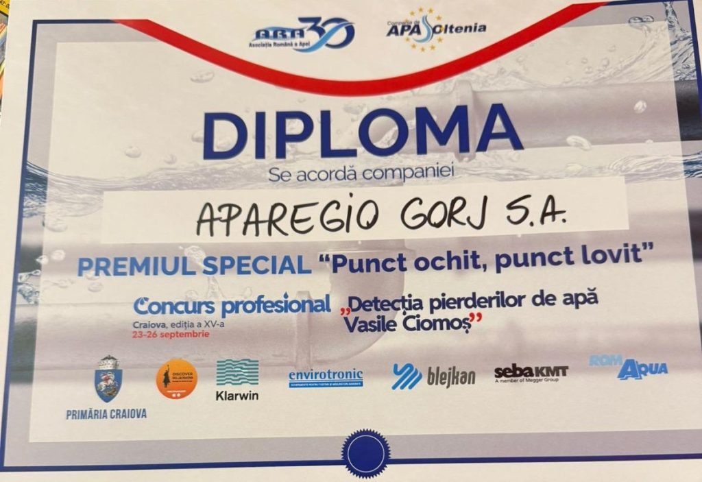 Zilele trecute, o echipă a operatorului a fost prezentă la Craiova, unde s-a desfășurat cea de-a XV-a ediție a concursului ”Detecția pierderilor de apă- Vasile Ciomos”. Șase echipe au primit Premiul Special ” Punct ochit, punct lovit”, Aparegio Gorj, reprezentată de Vlăduț Ciortan, Gabriel Micioi și Laurențiu Calotă, angajați în cadrul Departamentului Depistări Pierderi și Fraude, remarcându-se la probele concursului, fiind printre echipele premiate.