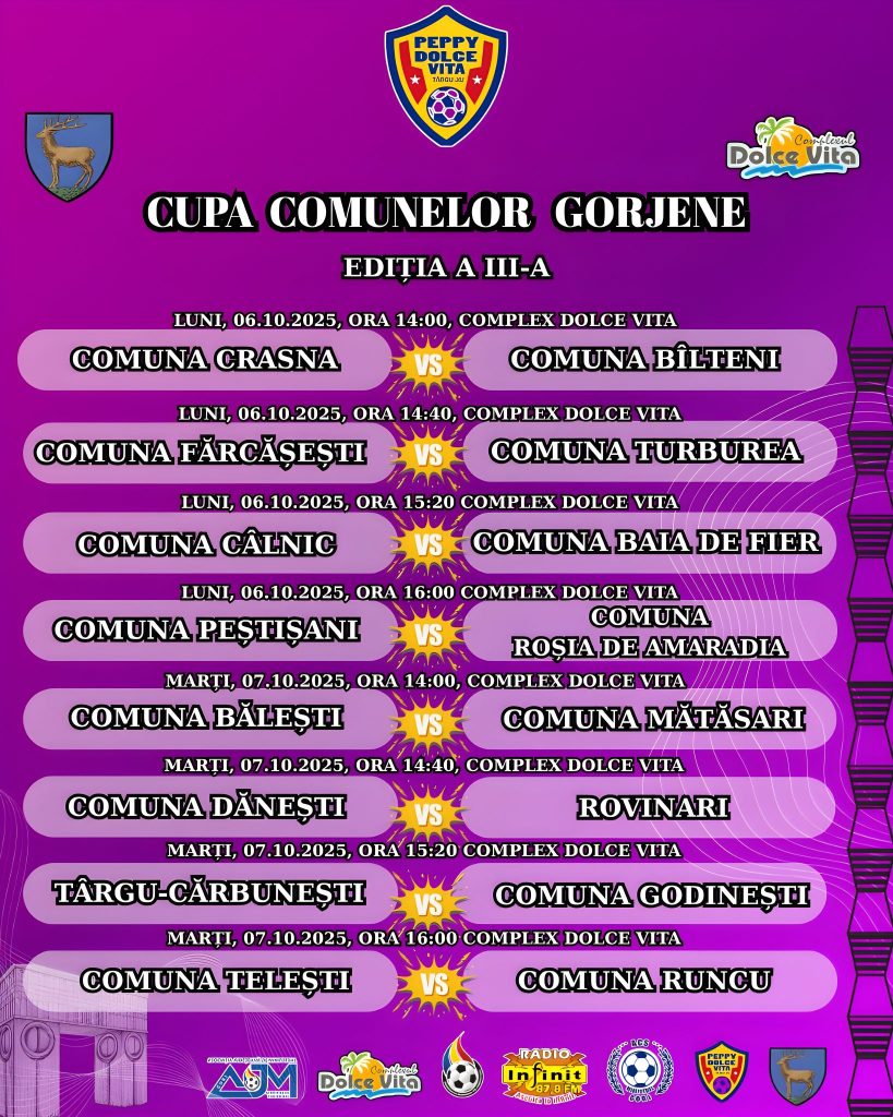 Miercuri, 1 octombrie 2025, începând cu ora 18:00, în incinta Complexului Dolce Vita, a avut loc tragerea la sorți a meciurilor din cadrul optimilor de finală ale Cupei Comunelor Gorjene la minifotbal. Competiția, ajunsă la cea de-a III-a ediție, este organizată cu sprijinul Consiliului Județean Gorj.