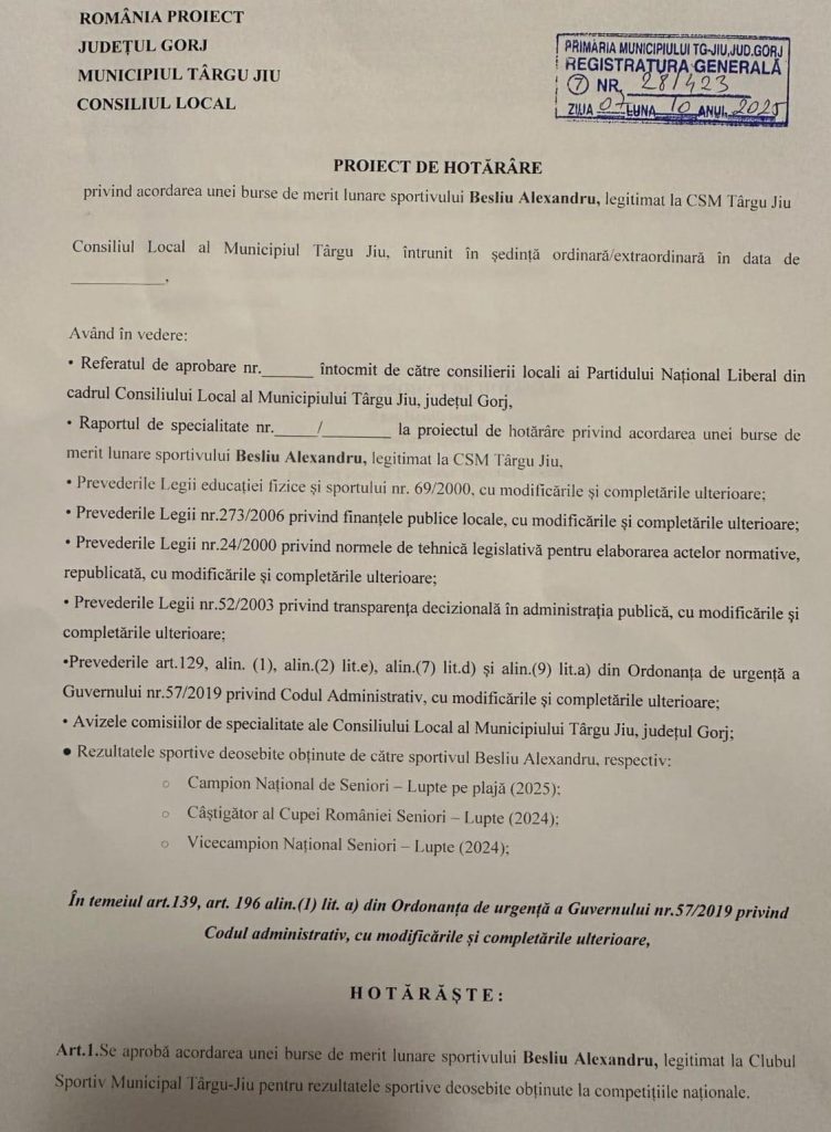 ”Alexandru Beșliu este un reper, fiind singurul senior la lupte din Târgu Jiu cu un palmares național constant, promovând imaginea orașului nostru de peste zece ani. Pentru ca această bursă să devină realitate, proiectul are nevoie de votul consilierilor locali, de aceea fac un apel la responsabilitate către toți colegii din CL Târgu Jiu să susțină această inițiativă. Este o investiție în viitorul sportului local și în tinerii care ne reprezintă comunitatea cu cinste. Îi dorim mult succes lui Alexandru la Campionatul Național individual de seniori din noiembrie!” a declarat Delia Răuț.