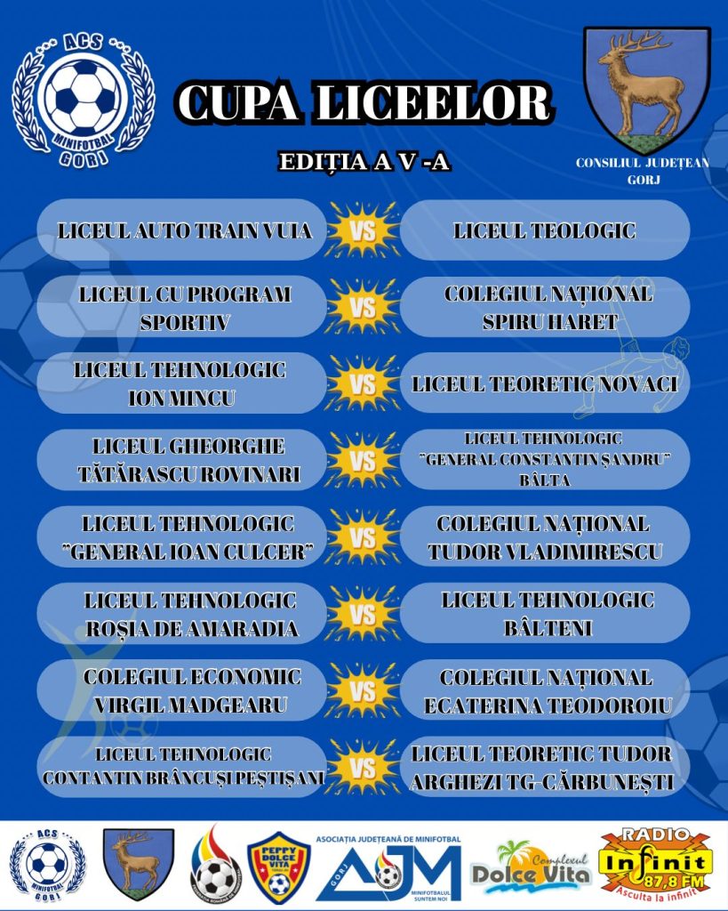 În urma tragerii la sorți, desfășurate, miercuri, de la ora 17:00, în cadrul Complexului Dolce Vita Târgu Jiu, au fost stabilite meciurile din optimile de finală ale Cupei Liceelor, ediția a V-a. Competiția este organizată cu sprijinul Consiliului Județean Gorj, printr-un proiect cofinanțat din bugetul județului Gorj pe anul 2025 și se desfășoară în Complexul Dolce Vita Târgu Jiu.