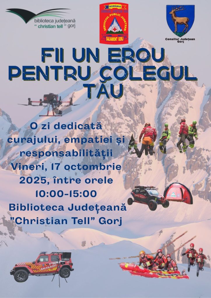 ”Primul ajutor începe cu tine! Vineri, 17 octombrie 2025, la Biblioteca Județeană „Christian Tell” Gorj, curajul, empatia și spiritul de echipă devin superputeri reale! Alătură-te proiectului educațional „Fii un erou pentru colegul tău” și descoperă cât de ușor poți transforma o zi obișnuită într-o aventură a bunătății și responsabilității! Împreună cu prietenii de la Salvamont și cu partenerii educaționali, învățăm să fim atenți, să reacționăm, să ajutăm și să credem în puterea gesturilor simple. Hai să învățăm să fim eroi — cu zâmbet, curaj și inimă mare!” transmite instituția.