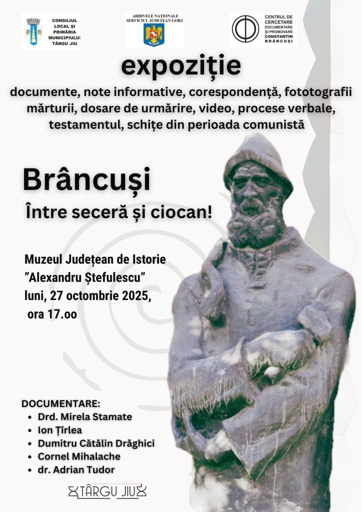 De la ora 17:00 are loc vernisajul expoziției-document „BRÂNCUȘI – ÎNTRE SECERĂ ȘI CIOCAN!”, la Muzeul Județean Gorj ,,Alexandru Ștefulescu”.