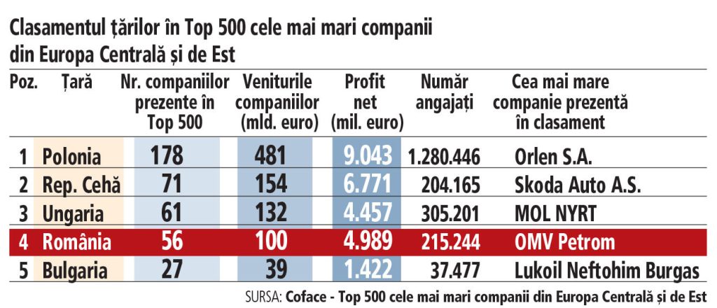 România se clasează pe locul al patrulea în regiune în Top 500 cele mai mari companii din Europa Centrală şi de Est, realizat de Coface, unde este reprezentantă de 56 de companii, cu două mai multe decât în ediţia anterioară, arată zf.ro.