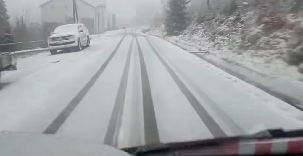 Drumarii intervin, sâmbătă, cu utilajele în stațiunea Rânca unde s-a așternut strat de zăpadă.