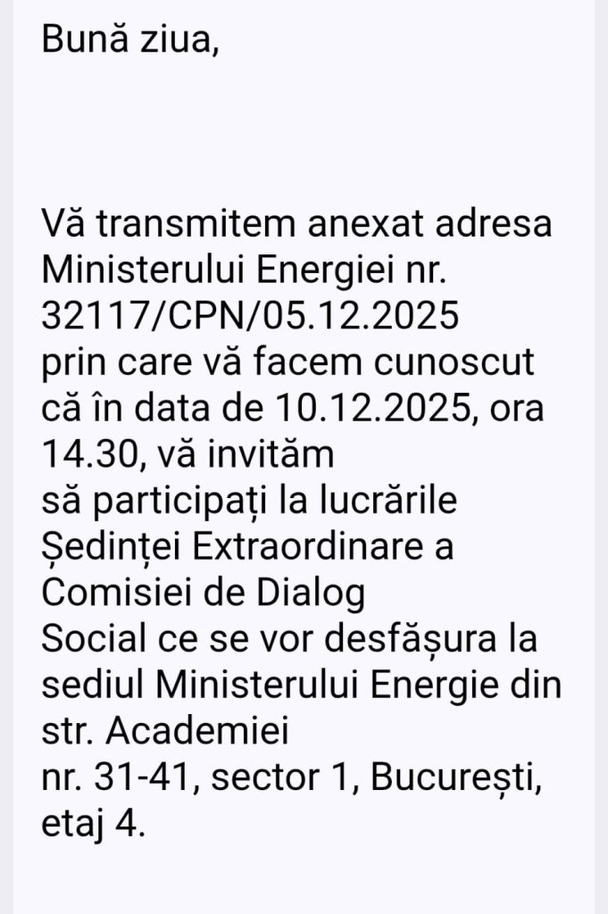 Sindicaliștii din cadrul societății Minprest Rovinari au fost invitați să participe miercuri, 10 decembrie, la ședința extraordinară a Comisiei de Dialog Social, ce se va desfășura la sediul Ministerului Energiei.