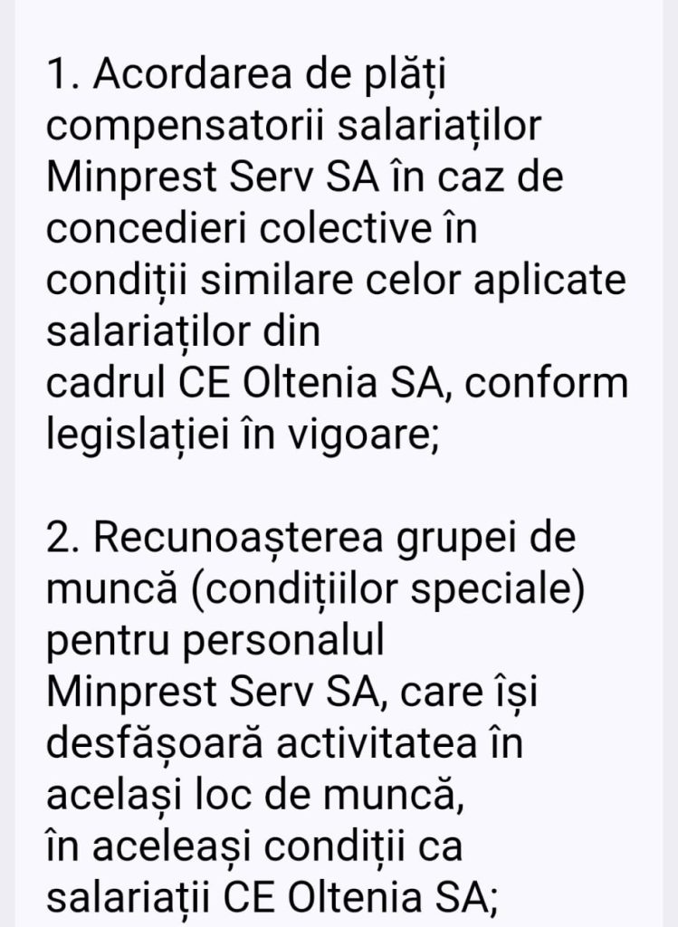 Pe ordinea de zi se află: acordarea de plăți compensatorii, în caz de concedieri colective, în condiții similare celor aplicate salariaților din cadrul Complexului Energetic Oltenia, conform legislației în vigoare și recunoașterea grupei de muncă, a condițiilor speciale, pentru personalul care își desfășoară activitatea în aceleași condiții ca salariații CEO.
