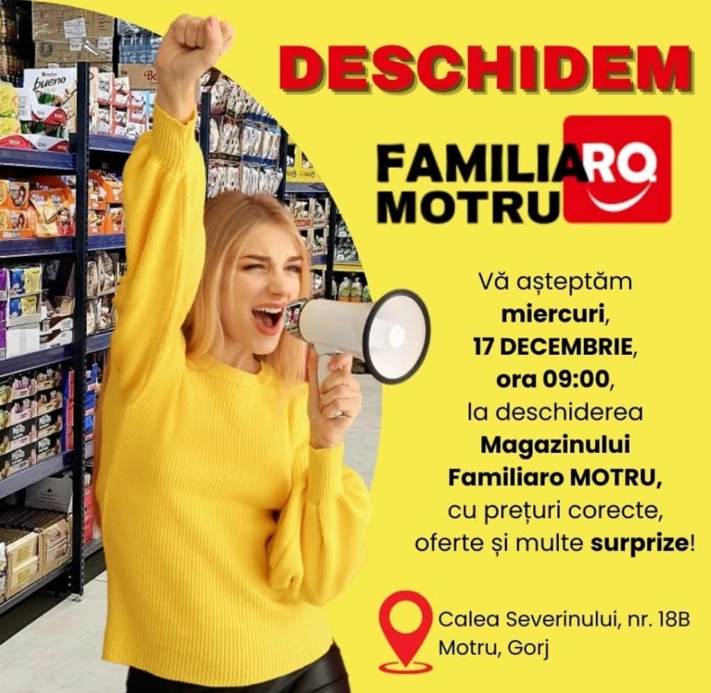 ”Suntem bucuroși să vă anunțăm că începând de miercuri, 17 decembrie 2025, deschidem oficial porțile noului nostru magazin din Motru, Calea Severinului, nr.18B. Vă așteptăm cu: o gamă variată de produse alimentare și nealimentare, prețuri corecte și accesibile, oferte speciale la deschidere, surprize pregătite pentru vizitatori. Totul, într-un spațiu prietenos și ușor de accesat, creat special pentru a fi aproape de nevoile familiei tale”, au transmis reprezentanții noii unități comerciale.