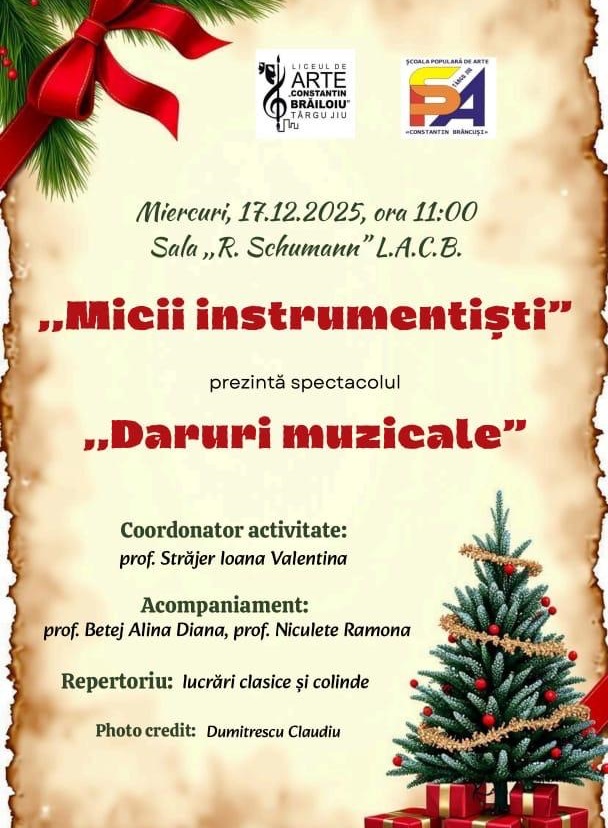 Miercuri, 17 decembrie 2025, ora 11:00, în Sala „R. Schumann” a Liceului de Arte „Constantin Brăiloiu” Târgu Jiu, se va desfășura spectacolul „Daruri muzicale”, susținut de „Micii instrumentiști”. Elevii Liceului de Arte și ai Școlii Populare de Arte „Constantin Brâncuși” Târgu Jiu vor oferi un recital cu lucrări clasice și colinde, sub coordonarea prof. Ioana Valentina Străjer, cu acompaniamentul prof. Alina Diana Betej și prof. Ramona Niculete.