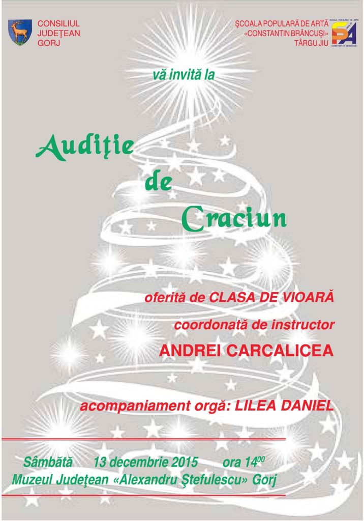 Sâmbătă, 13 decembrie , începând cu ora 11:00, la Riviera by Anna Events, va avea loc o nouă ediție a tradiționalului eveniment ”Sub bradul de Crăciun”, eveniment ce va reuni peste 200 de copii și tineri. Publicul se va bucura de momente artistice susținute de cursanții școlii, pasionați de muzică și dans. Colindele și piesele din repertoriul specific iernii vor aduce bucuria Crăciunului într-o atmosferă caldă,posibilă prin munca cursanților noștri și cu sprijinul părinților. De asemenea, de la ora 14:00, vă așteptăm la Muzeul Județean Gorj ”Alexandru Ștefulescu” la Audiția deCrăciun susținută de clasa de vioară, coordonată de Andrei carcalicea, dirijorul Ansamblului Folcloric ”Maria Lătărețu” Târgu Jiu. Micii instrumentitști au pregătit piese din folclorul autentic gorjenesc, dar și un program de colinde.