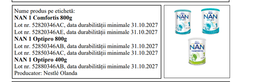 ”Nestlé România iniţiază rechemarea voluntară, pentru o cantitate limitată, din produsul NAN 1 Optipro 400g cu datele de identificare de mai sus, ca măsură de precauţie din cauza identificarii prezenţei Bacillus cereus pe una dintre liniile de producţie din fabrica de origine, linie pe care au fost produse loturile vizate. Siguranţa şi bunăstarea sugarilor este prioritatea noastră absolută. Menţionăm că nu au fost primite sesizări cu privire la efecte adverse asociate consumului produselor din loturile menţionate, rechemarea voluntară a acestora reprezentând o măsură de precauţie”, este anunţul Profi, postat, vineri, pe site-ul ANSVSA.