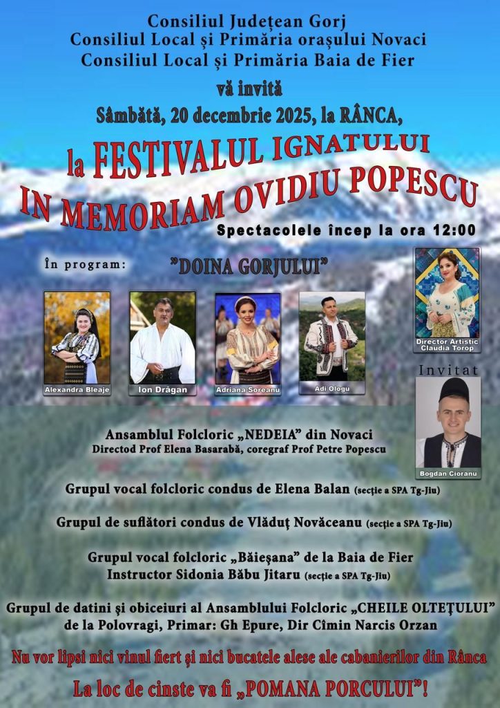 „Vă așteptăm în Rânca! Când? Sâmbătă, 20 Decembrie, ora 12.00. De ce? Timp de câteva ore bune muntele va răsuna de colinde, perioadă în care se pregătesc și cele mai bune bucate. Împreună petrecem cele mai frumoase momente din acest sfârșit de an!”a transmis Anca Bordușanu, vicepreședintele Consiliului Județean Gorj.