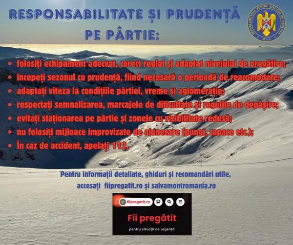 ”Vacanța de iarnă aduce bucuria zăpezii și a timpului petrecut la munte. Pentru ca aceste momente să rămână plăcute și lipsite de incidente, este important ca fiecare practicant al sporturilor de iarnă să manifeste prudență și responsabilitate pe pârtie. În acest sens, salvamontiștii recomandă folosirea unui echipament adecvat, adaptarea vitezei și a stilului de coborâre la condițiile de pe pârtie, respectarea semnalizării și a regulilor de schi, precum și evitarea utilizării mijloacelor improvizate de alunecare. În cazul producerii unui accident, apelați 112”, a transmis Departamentul pentru Situații de Urgență.