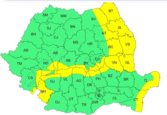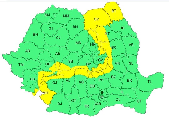 O atenţionare meteorologică cod calben vizează intervalul 26 decembrie, ora 14:00 – 27 decembrie, ora 16:00.