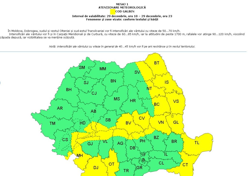 Potrivit ANM, în Moldova, Dobrogea, sudul și vestul Olteniei și sud-estul Transilvaniei vor fi intensificări ale vântului cu viteze de 50-70 km/h.