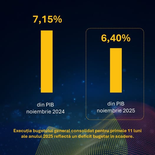 „Execuția bugetară pe primele 11 luni din 2025, publicatǎ de Finanțe, arată că deficitul a scăzut cu 0,74 puncte procentuale sub nivelul din aceeași perioadă a anului trecut, ajungând la 6,40% din PIB. Exact ceea ce am subliniat înainte de publicarea cifrelor oficiale: eficiența mǎsurilor luate în acest an se vede în rezultate concrete. Reducerea deficitului înseamnă că statul cheltuie mai responsabil, se împrumută mai puțin și are mai multă stabilitate financiară. Acest lucru înseamnă costuri mai mici cu dobânzile, mai multă încredere din partea investitorilor și mai mulți bani disponibili pentru dezvoltare”, subliniază Alexandru Nazare, într-o postare pe pagina sa de Facebook.
