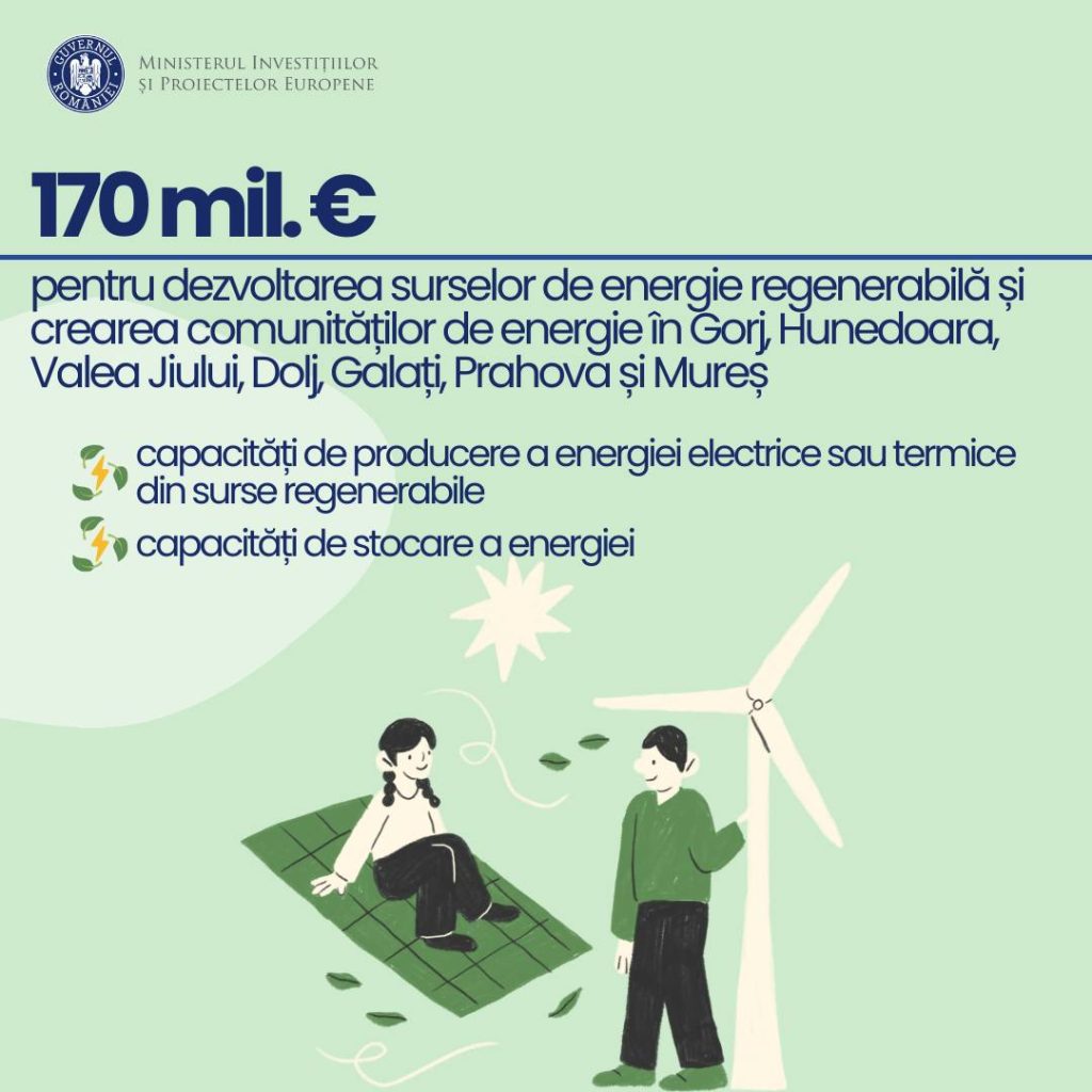 Ministerul Investițiilor și Proiectelor Europene a publicat Ghidul Solicitantului pentru un apel de proiecte competitiv, pe Fondul de Tranziție Justă, destinat UAT-urilor, în valoare de 170 de milioane euro, dedicat dezvoltării surselor de energie regenerabilă și creării comunităților de energie.