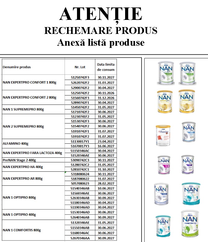 Autoritatea Națională Sanitară Veterinară și pentru Siguranța Alimentelor informează consumatorii despre o rechemare de produse. Nestlé România retrage voluntar de pe piață loturi de formule de lapte pentru sugari.