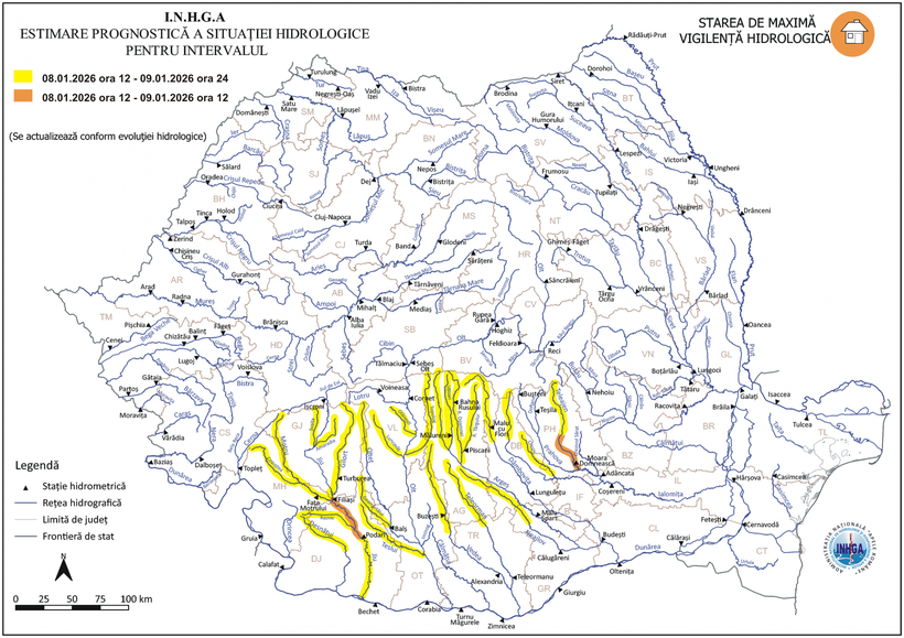 În intervalul 08.01.2026 ora 12:00 – 09.01.2026 ora 12:00 pe râurile din bazinele hidrografice a intrat în vigoare o avertizare Cod portocaliu de inundaţii, pe râul Jiu, sectorul aval confluenţă cu râul Motru – amonte S.H. Podari (judeţul Dolj) şi pe râul Teleajen pe sectorul aval confluenţă cu râul Vărbilău (judeţul Prahova).