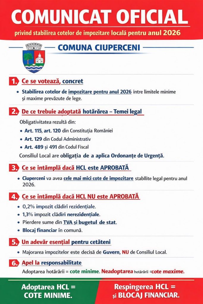 Consilierii locali din comuna Ciuperceni nu au votat noile taxe și impozite majorate, așa cum a decis guvernul. Primarul liberal Claudiu Dragotă spune că situația s-a politizat, iar cei care se opun sunt aleșii PSD și Forța Dreptei.