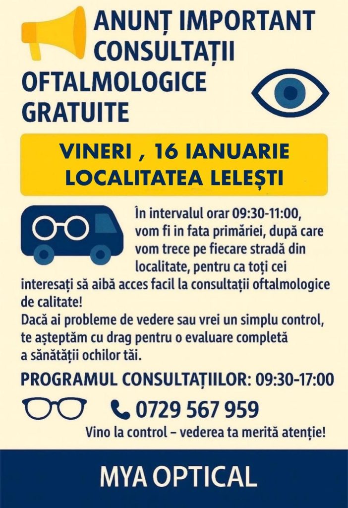 Consultații oftalmologice gratuite, astăzi, în comuna Lelești, oferite de MYA OPTICAL.