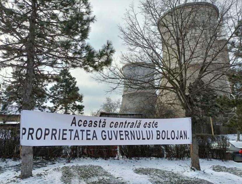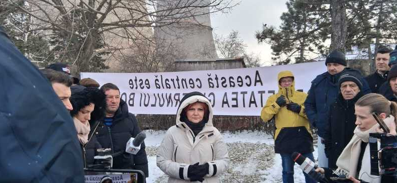 În fața Electrocentrale Craiova a fost pus un banner pe care scrie ”Această centrală este proprietatea Guvernului Bolojan”.