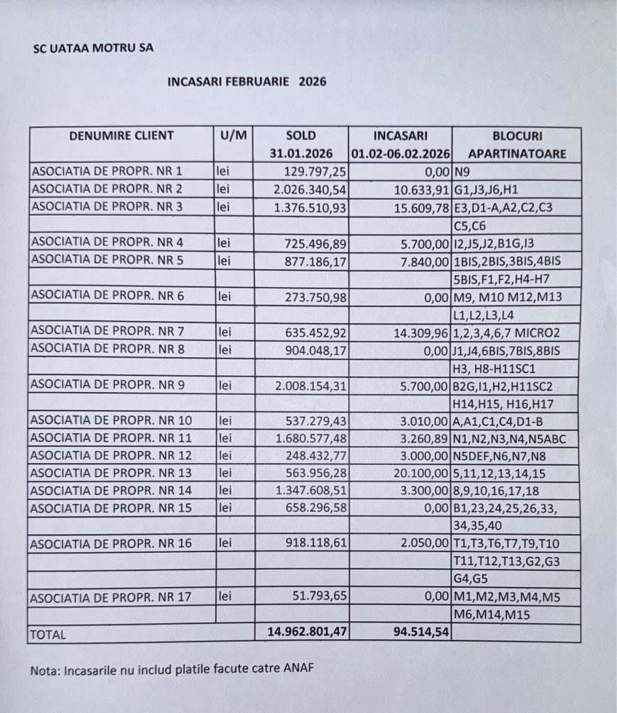 „În lipsa unui sprijin din partea Guvernului pentru reluarea furnizării agentului termic, continuarea sistemului de termoficare depinde de implicarea directă a populației.Achitarea a minimum 25% din datoriile restante poate face posibilă repornirea furnizării de căldură, fiind singura soluție pe termen scurt. De reținut: Datoriile nu se anulează. Acestea vor fi recuperate, inclusiv în situația în care UATAA își va înceta activitatea. Situația datoriilor: UATAA înregistrează datorii de 8.547.241,91 lei, sumă care nu include obligațiile stabilite prin deciziile de impunere ale Ministerului Mediului” a comunicat UATAA Motru.