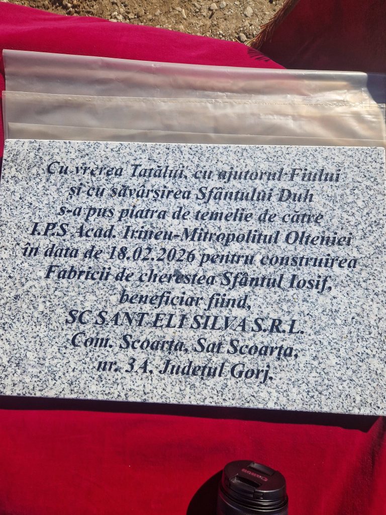 ”Primăria Comunei Scoarța aduce la cunoștința cetățenilor că, azi 18.02.2026, a avut loc, cu binecuvântarea lui Dumnezeu, ceremonia de punere a primei pietre la temelia noii fabrici de cherestea din comună. La acest moment deosebit pentru comunitatea noastră a participat Înaltpreasfințitul Părinte Irineu, Arhiepiscopul Craiovei, alături de un sobor de preoți, autorități locale și numeroși cetățeni ai comunei. Evenimentul a fost marcat prin săvârșirea unei slujbe de binecuvântare, noua investiție fiind pusă sub ocrotirea Sfântului Iosif, simbol al muncii cinstite și al credinței statornice. Această inițiativă reprezintă un pas important pentru dezvoltarea economică a comunei Scoarța și pentru crearea de noi locuri de muncă în folosul comunității. Mulțumim tuturor celor care au fost prezenți și au contribuit la organizarea acestui eveniment” transmite primarul Ion Stamatoiu.