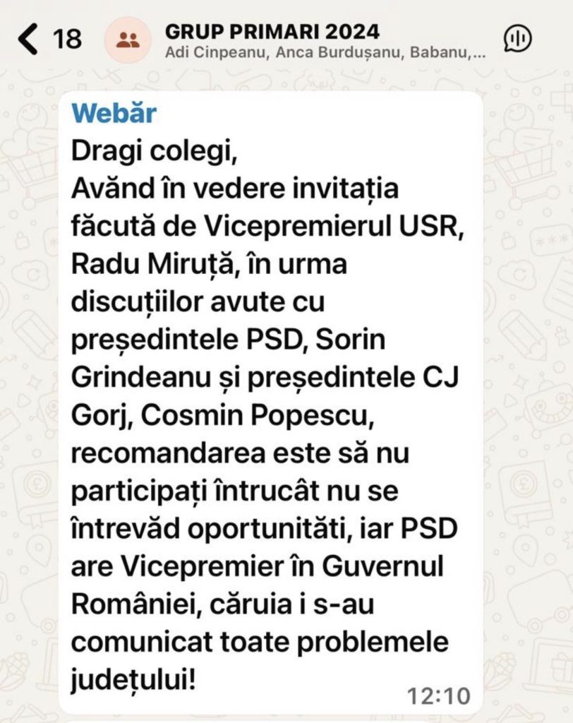În mesajul transmis pe grupul de Whatsapp, liderul PSD Gorj, Mihai Weber, le-a transmis primarilor că a discutat cu președintele partidului, Sorin Grindeanu și cu șeful Consiliului Județean Gorj, Cosmin Popescu și le recomandă să nu participe la discuțiile cu Radu Miruță pentru că ”nu se întrevăd oportunități”.
