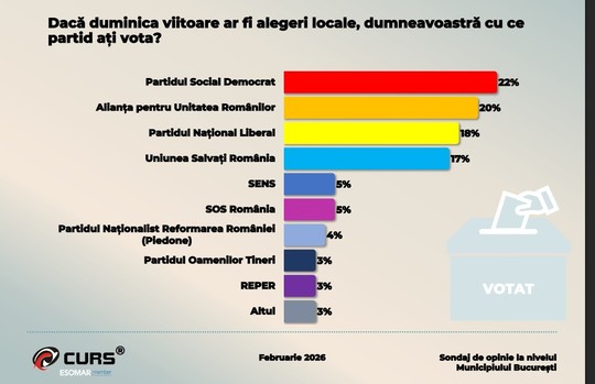 În ipoteza organizării unor alegeri locale duminica viitoare, Partidul Social Democrat ar obţine 22% din voturile bucureştenilor, fiind urmat de Alianţa pentru Unitatea Românilor, cu 20%. Partidul Naţional Liberal este cotat cu 18%, iar Uniunea Salvaţi România cu 17%. SENS ar obţine 5%, SOS România 5%, Partidul Naţionalist Reformarea României (Piedone) 4%, iar Partidul Oamenilor Tineri şi REPER 3%. Alte formaţiuni ar strânge 3%.
