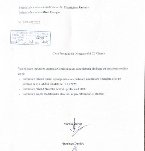Sindicaliștii solicită informări legate de planul de reorganizare, restructurare și redresare financiară aflat pe ordinea de zi a Adunării Generale a Acționarilor din 12 martie. În plus, vor să vadă proiectul de buget de venituri și cheltuieli pe anul 2026 și să li se prezinte modificările structurii organizatorice a CE Oltenia.