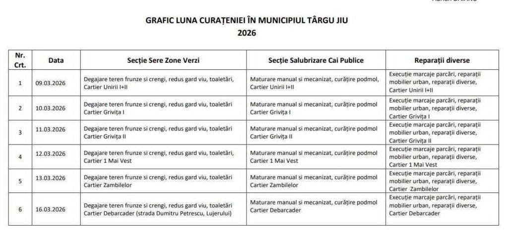 ”Începând cu 9 martie, dăm startul unei acțiuni ample de curățenie în municipiul Târgu Jiu – „Luna Curățeniei”. Echipele Edilitara Public S.A. – din sectoarele de salubrizare, spații verzi, reparații, mecanizare și celelalte servicii operative – se vor deplasa în cartierele orașului conform graficului stabilit pentru: curățenie generală, igienizarea spațiilor verzi, întreținerea domeniului public, ridicarea deșeurilor abandonate. Pentru o organizare eficientă, sprijinul asociațiilor de proprietari este foarte important. Prezența unui reprezentant în momentul intervenției facilitează comunicarea directă cu echipele din teren, semnalarea punctuală a problemelor din zonă, formularea de propuneri din partea locuitorilor” a anunțat primarul Marcel Romanescu.