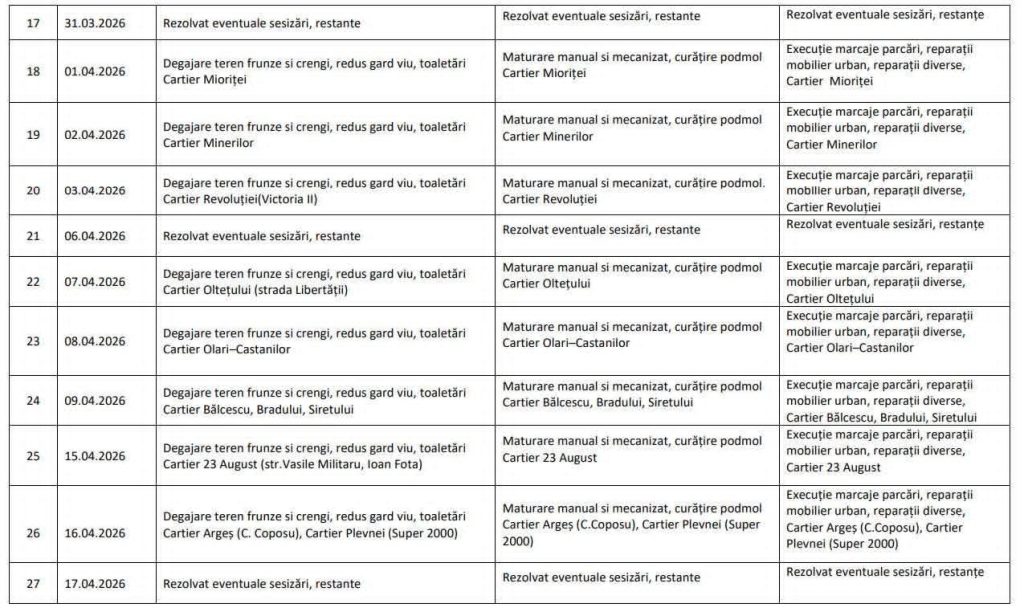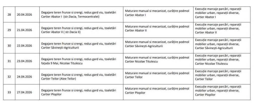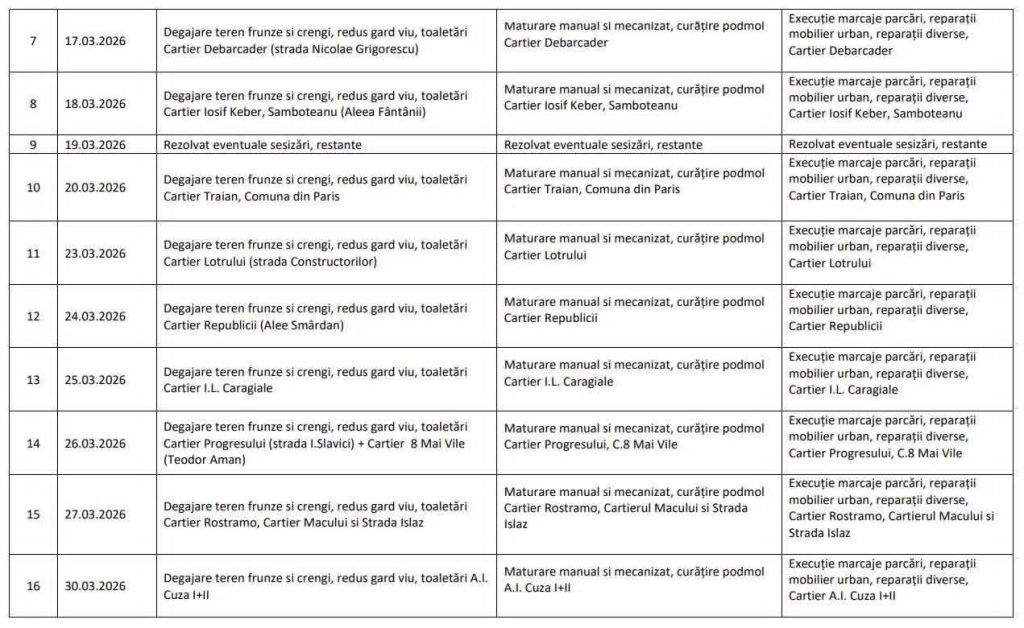 ”Dacă apar schimbări, vom informa din timp prin canalele oficiale. Graficul intervențiilor va fi publicat periodic, astfel încât toți cetățenii să știe când ajungem în zona lor. Ne dorim ca această acțiune să însemne mai mult decât o simplă curățenie – să fie un angajament comun pentru un oraș mai curat, mai îngrijit și mai respectat de fiecare dintre noi” a mai transmis Romanescu.