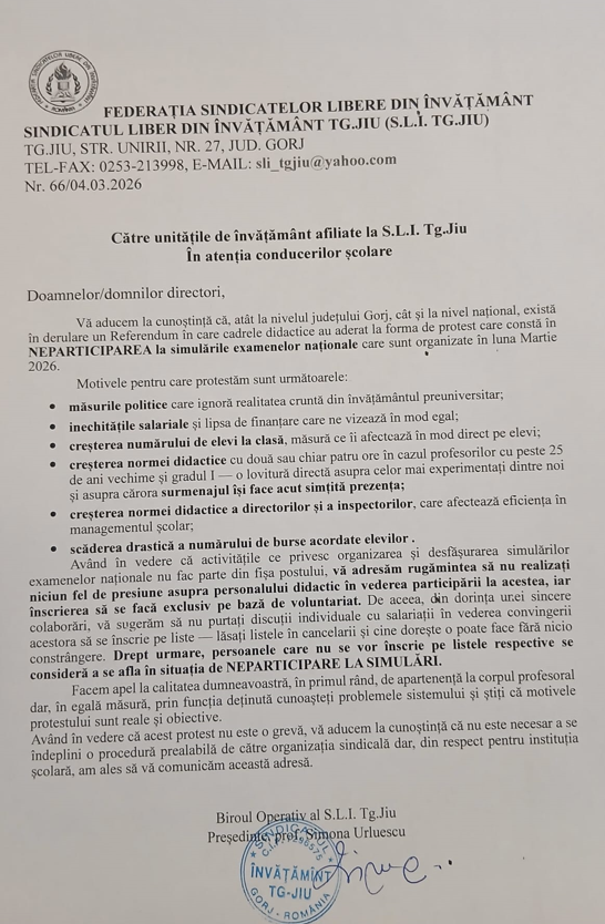 „Nu semnați niciun document prin care să vă asumați participarea la simulările examenelor naționale din luna martie. Nu cedați presiunilor de a fi incluși în organizarea simulărilor”, le transmit liderii sindicali profesorilor.