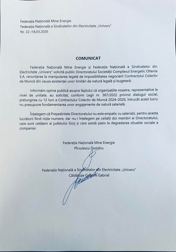 Printr-un comunicat de presă, transmis miercuri, Federația Națională Mine Energie și Federația Națională a Sindicatelor din Electricitate „Univers” solicită public directoratului Societății Complexul Energetic Oltenia S.A. ”renunțarea la manipularea legată de imposibilitatea negocierii Contractului Colectiv de Muncă din cauza existenței unor limitări de natură legală și bugetară”.