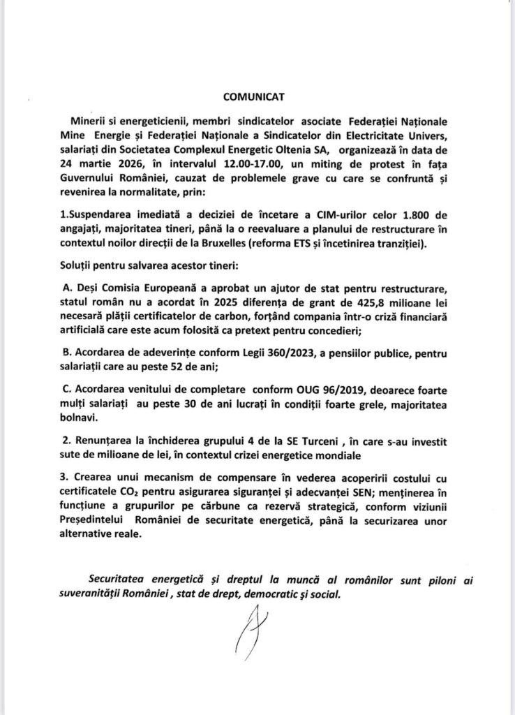 Minerii și energeticienii, membri ai sindicatelor asociate Federației Naționale Mine Energie și Federației Naționale a Sindicatelor din Electricitate Univers, salariați din Societatea Complexul Energetic Oltenia SA, organizează în data de 24 martie 2026, în intervalul 12:00–17:00, un miting de protest în fața Guvernului României, cauzat de problemele grave cu care se confruntă și pentru revenirea la normalitate, prin: