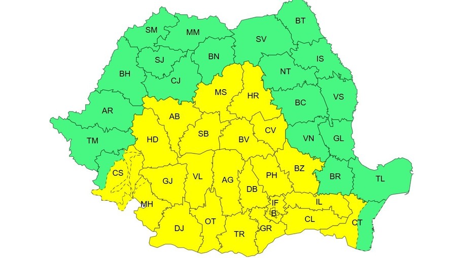 Meteorologii au emis, joi, mai multe avertizări cod galben de vânt puternic, fiind vizate zonele montane, dar şi sudul Banatului, Oltenia, cea mai mare parte a Munteniei şi Transilvaniei şi sud-vestul Dobrogei. În zonele înalte, rafalele pot ajunge la 100 de kilometri la oră, în timp ce în zonele joase se vor înregistra frecvent 50-70 de kilometri la oră.