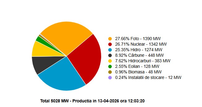 Energia solară contribuia cel mai mult la mixul energetic la această oră (1.379 MW), urmat de producția celor două reactoare de la Cernavodă (1.340 MW) și apoi apele (1.275 MW). Din graficele Translectrica se poate remarca faptul că producția hidro a fost redusă peste zi – când a crescut cea solară – de la niveluri de 2.200 – 2.700 MW în timpul nopții: