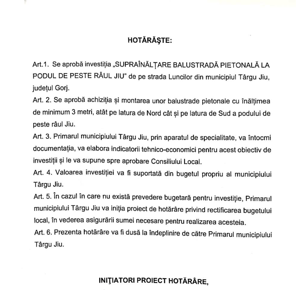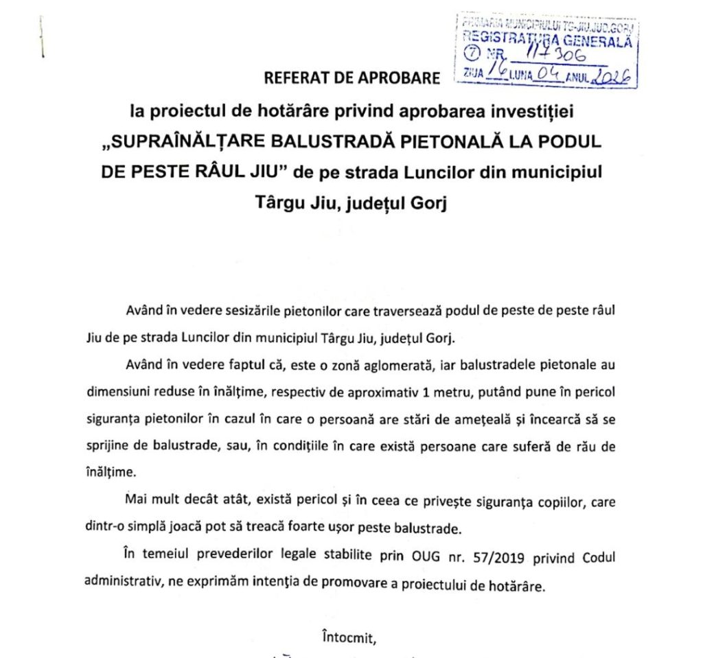 ”Având în vedere faptul că, Primăria Municipiului Târgu Jiu s-a apucat de reasfaltat podul de peste râul Jiu, de pe strada Luncilor (zona Kaufland), dar a uitat din nou de siguranța pietonilor, consilierii AUR Târgu Jiu, Adana Negrea, Andreea Cretan și Eduard Lădaru, au inițiat un proiect de hotărâre privind supraînălțarea balustradei pietonale la podul de peste râul Jiu, de pe strada Luncilor, pentru siguranța pietonilor. Acest proiect de hotărâre a fost inițiat, la sesizarea pietonilor, având în vedere înălțimea mică, de aproximativ un metru, putând pune în pericol siguranța acestora” a transmis liderul AUR Târgu Jiu, Eduard Lădaru.