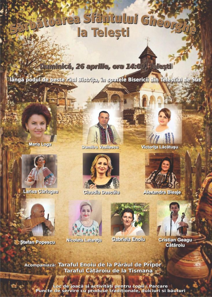 ”Duminică, 26 aprilie, începând cu ora 14:00, vă invităm lângă râul Bistrița (podul din spatele bisericii din Teleștiul de Sus), să ne întoarcem la rădăcini, să ne cinstim înaintașii și să ne prindem cu toții în horă. Readucem la viață Sărbătoarea Sfântului Gheorghe, eveniment de tradiție al comunei noastre, întrerupt de-a lungul anilor, din respect pentru trecut și din dorința de a păstra în memoria comunității tradițiile și obiceiurile locului. Mulțumim artiștilor care vin, cu sufletul deschis, să redea farmecul acestei sărbători, precum și colaboratorilor și autorităților locale, Primăria și Consiliul Local Telești, pentru sprijinul acordat în amenajarea spațiului de desfășurare. Vă așteptăm cu drag să reînviem tradiția noastră sub ocrotirea Sfântului Gheorghe, cu respect pentru rădăcini și recunoștință pentru moștenire” transmit organizatorii.