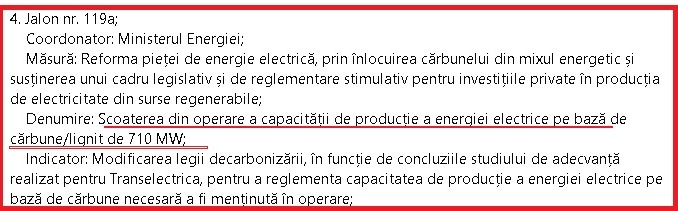 Denumire: Scoaterea din operare a capacității de producție a energiei electrice pe bază de cărbune/lignit de 710 MW;