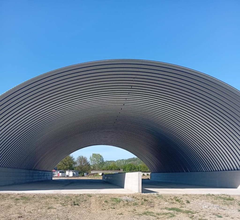 Platforma contribuie la optimizarea procesului tehnologic și la protecția mediului, asigurând condiții eficiente pentru depozitarea nămolurilor deshidratate. Construcția este realizată cu o structură metalică autoportantă, cu formă arcuită, având dimensiunile de 25,75 x 48,00 m și o înălțime maximă de 10,40 m. Structura este susținută de pereți laterali din beton armat și include un perete de compartimentare, fiind proiectată pentru funcționare eficientă și durabilă.