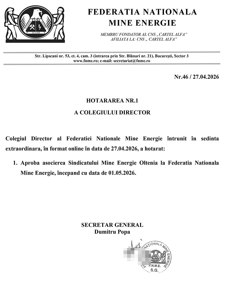 Colegiul Director al Federației Naționale Mine Energie a aprobat, luni, asocierea Sindicatului Mine Energie Oltenia, condus de Gabriel Căldărușe și Jan Popescu, cel mai numeros din Complexul Energetic Oltenia.