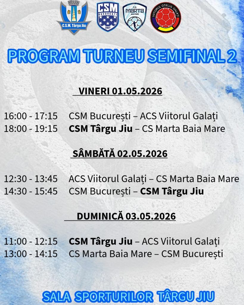 În perioada 1-3 mai, Sala Sporturilor va fi gazda meciurilor din Grupa 4 – Turneul Semifinal 2 din cadrul Campionatului Național Feminin Junioare 3, un turneu de mare importanță pentru handbalul feminin juvenil din Târgu Jiu. Junioarele pregătite de Andrei Enache și Ionuț Mazilu au șansa să se califice între cele mai bune 8 formații din țară.